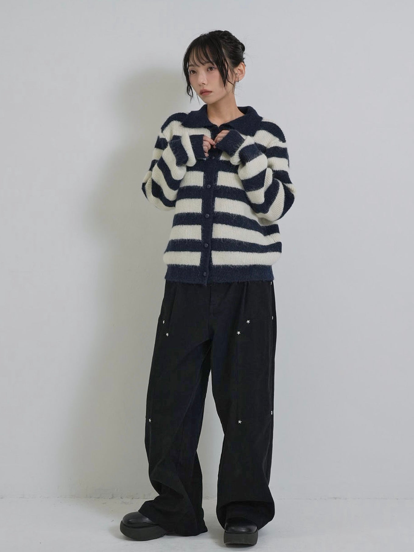 小さめの襟がアクセントになり、カジュアルながらも上品な印象に。