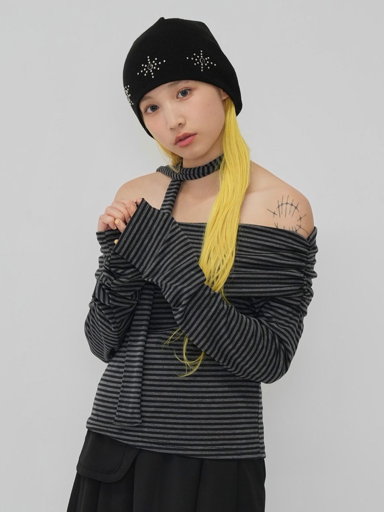 細めのボーダー柄がシックで大人っぽい印象を演出しながら、
