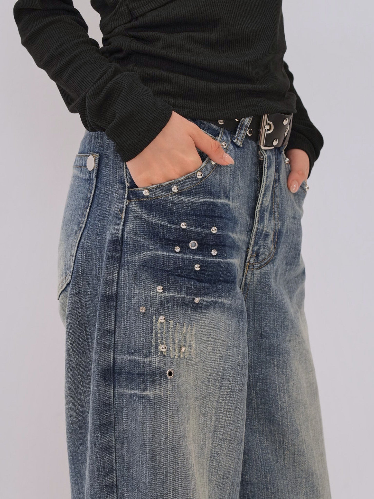 ほどよいヴィンテージ感とモードな装飾が目を引くワイドデニム。