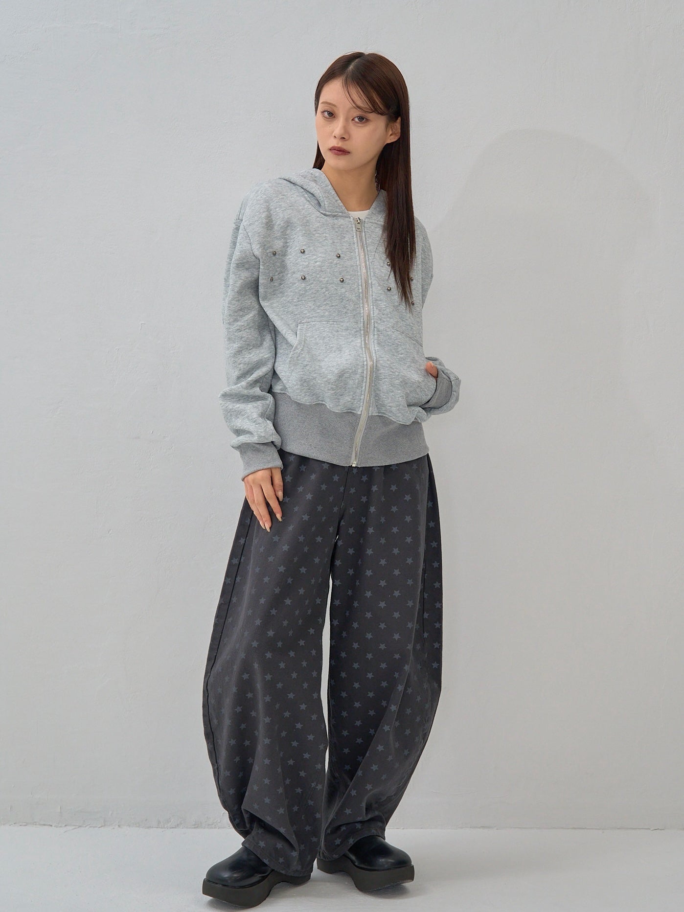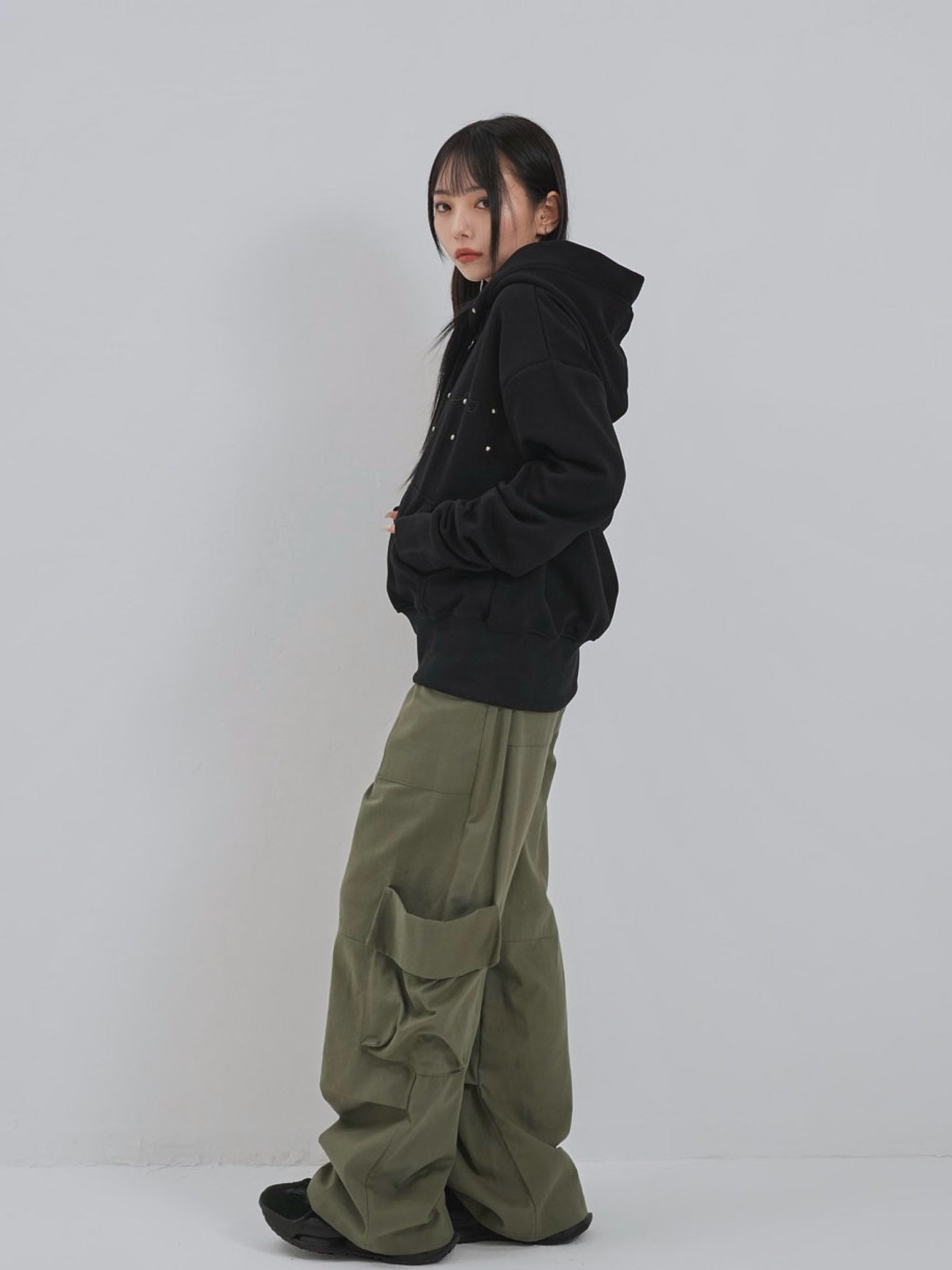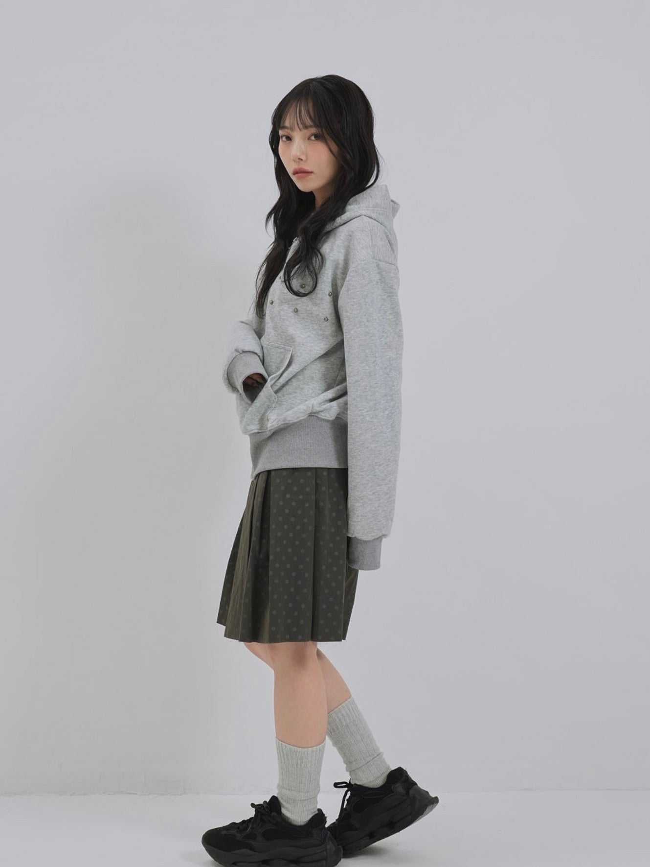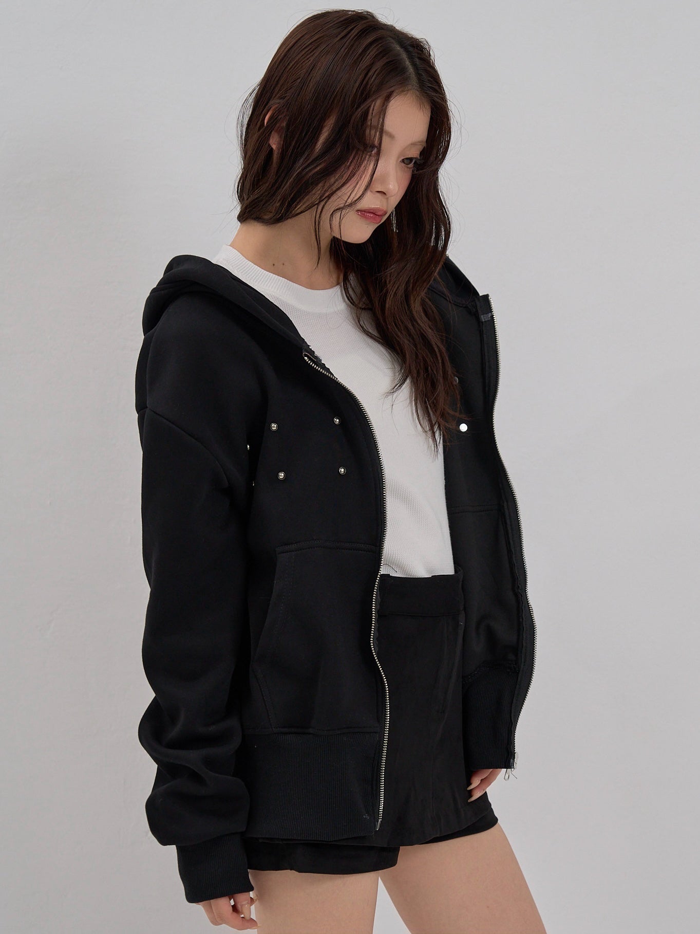さりげない輝きが視線を惹きつける「metal ball hoodie」。