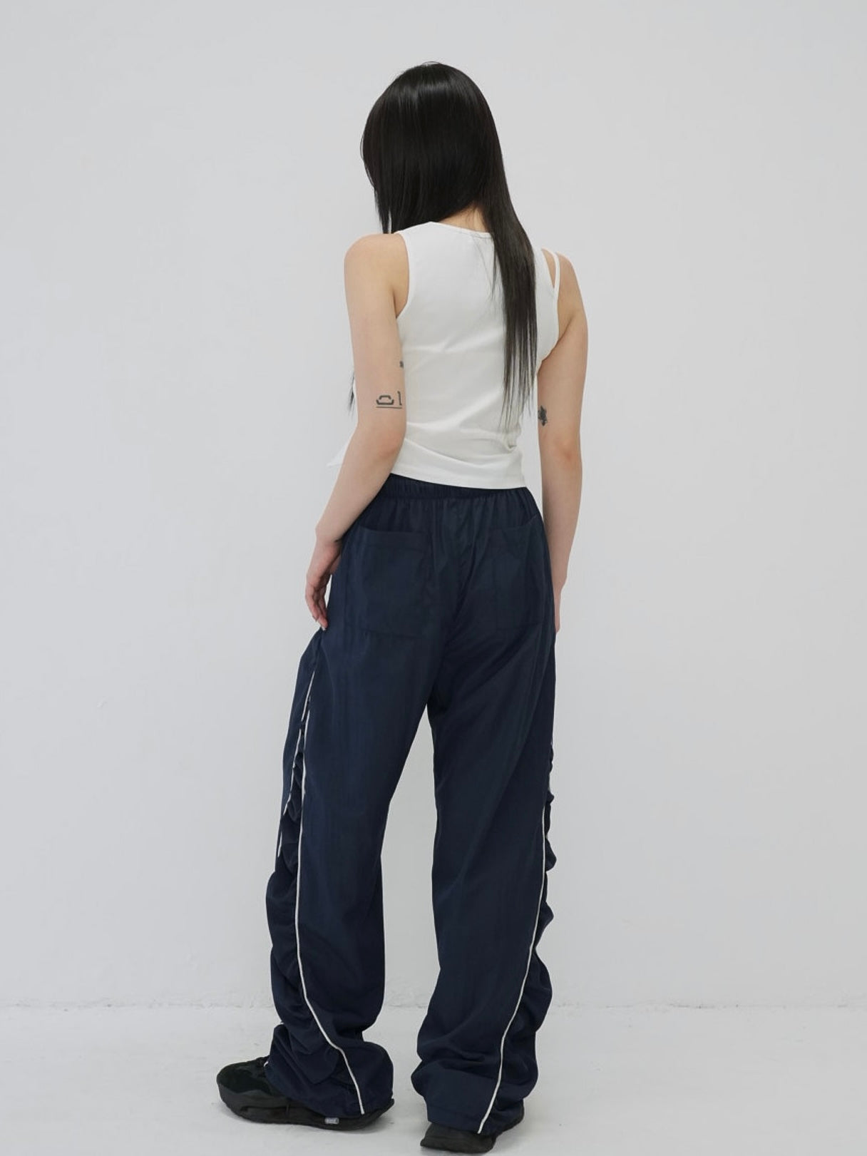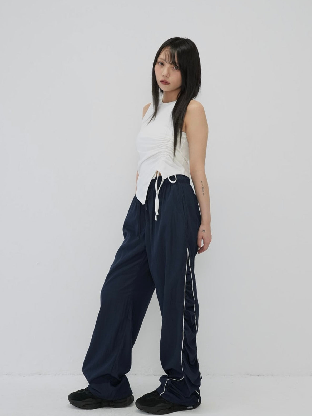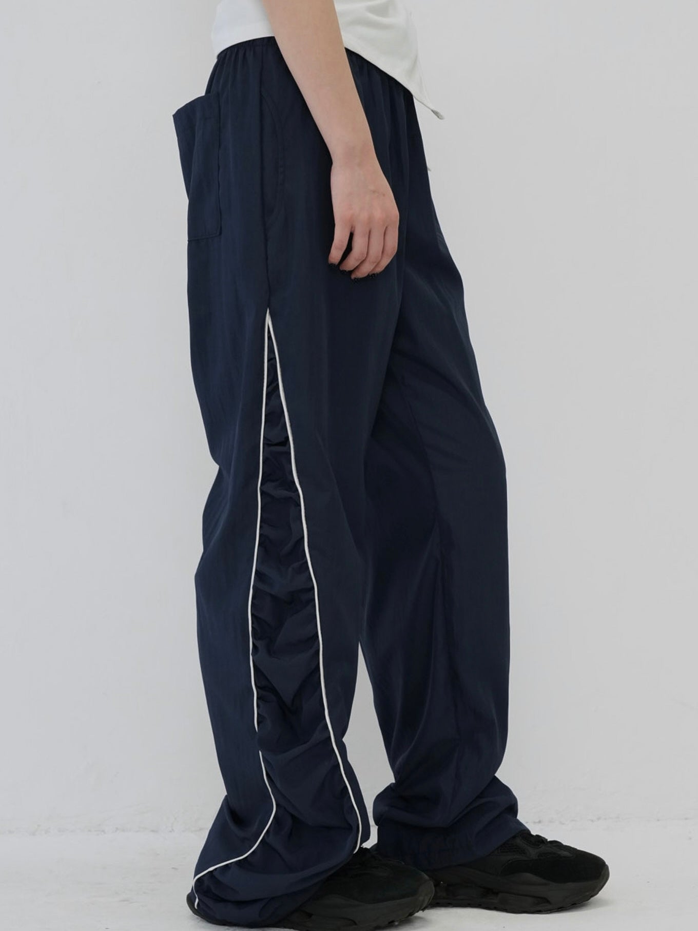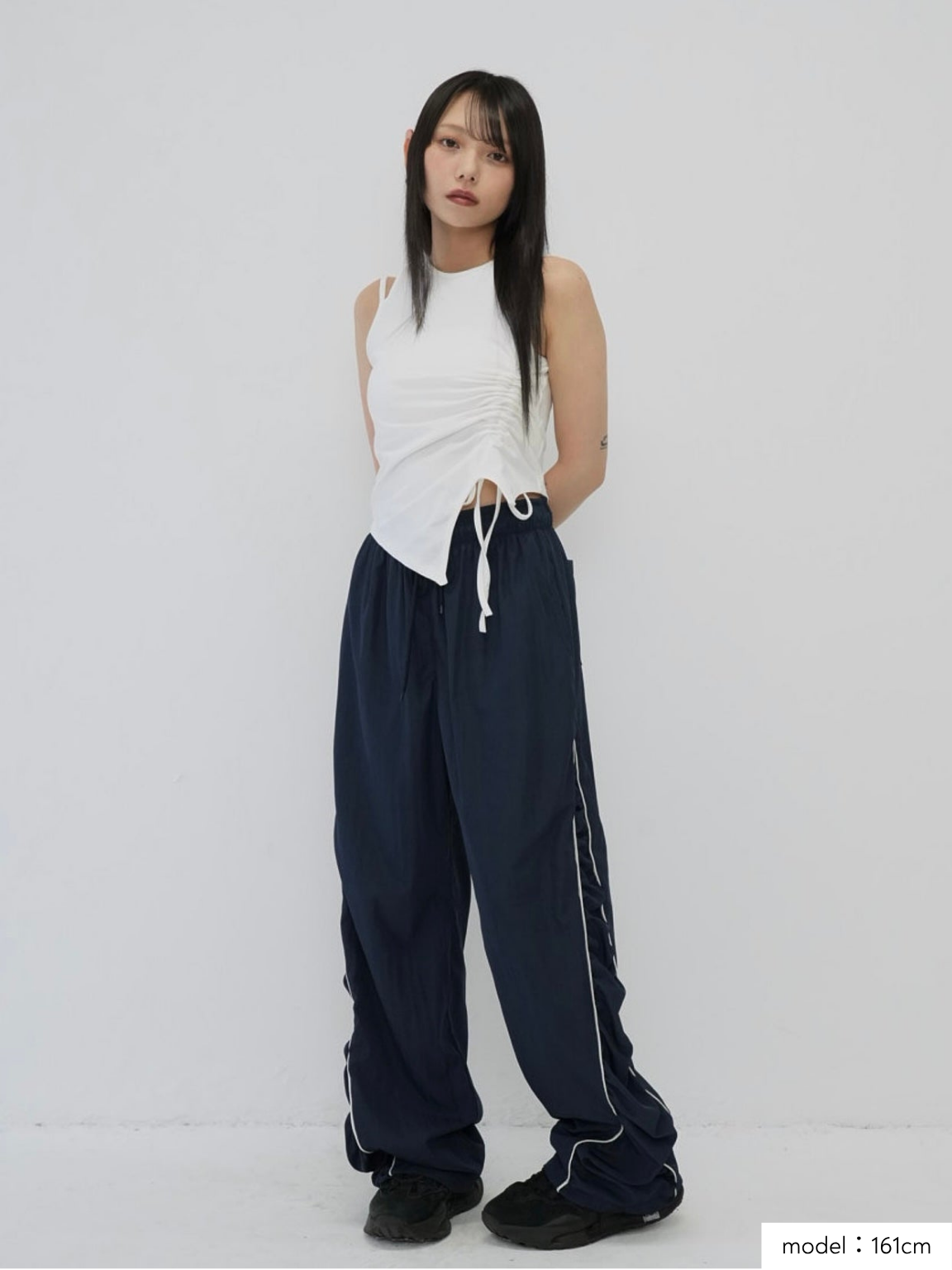 サイドのシャーリング加工とパイピングがアクセントになったデザインパンツ。