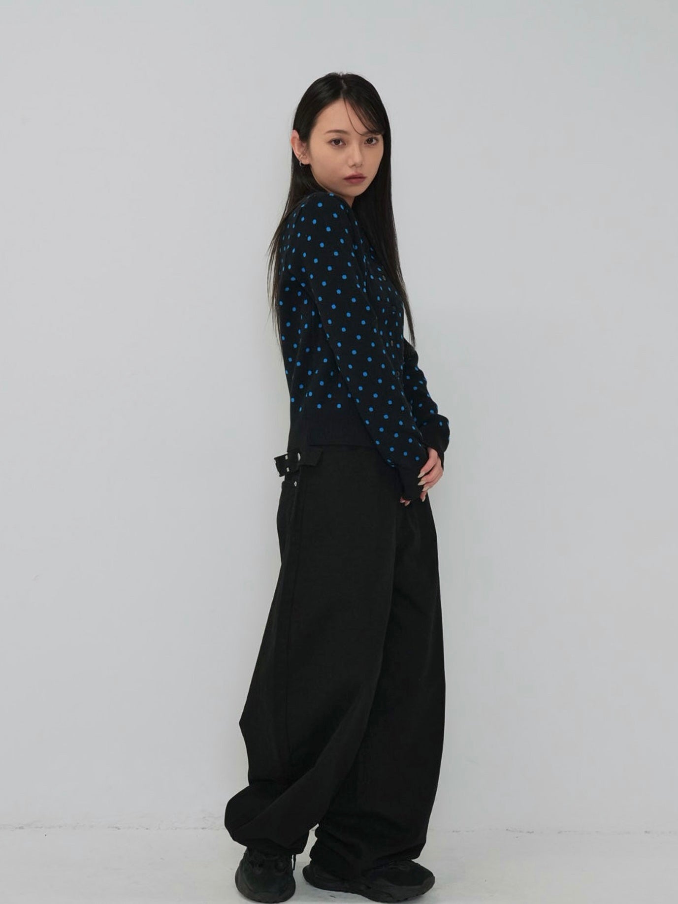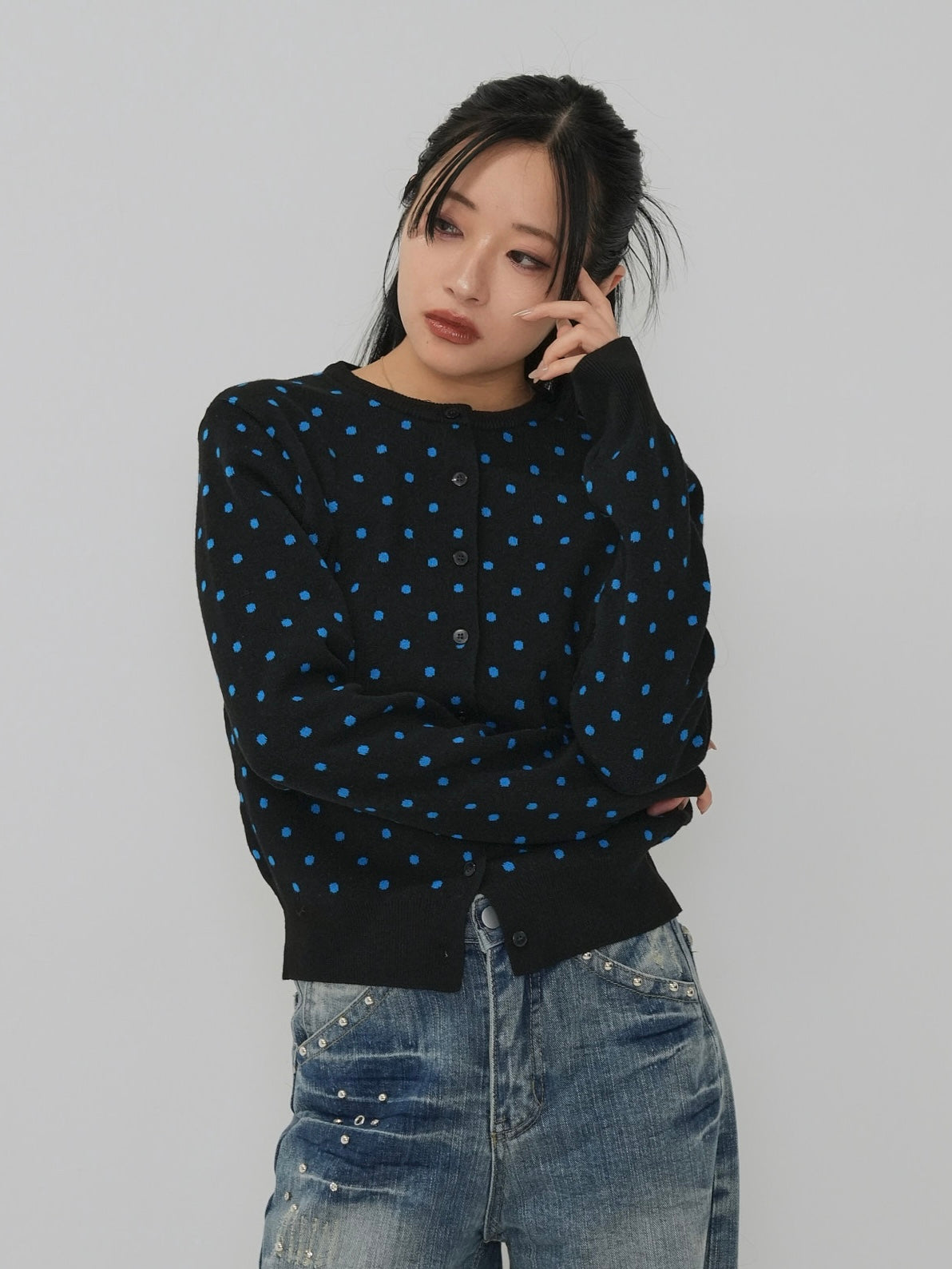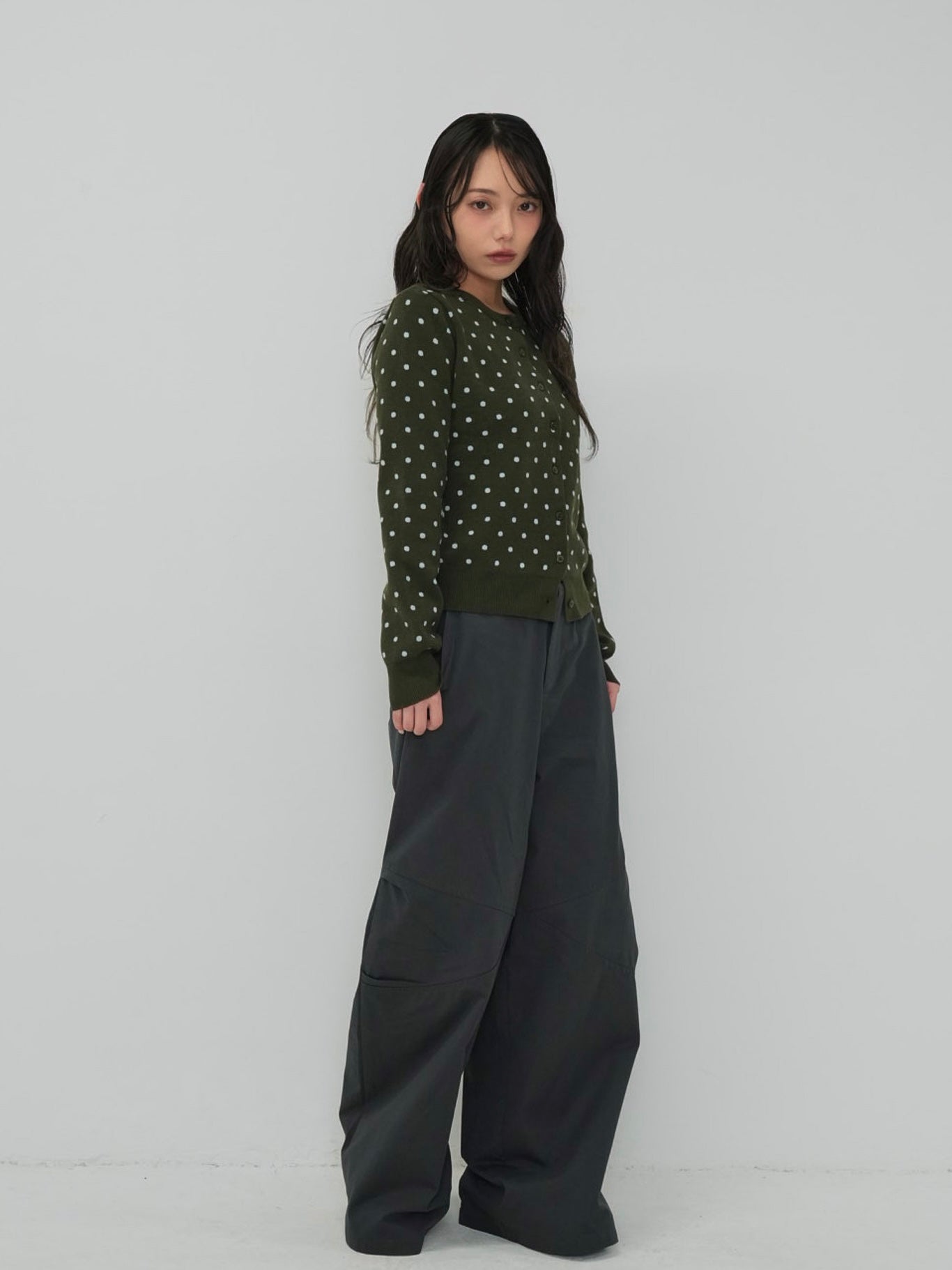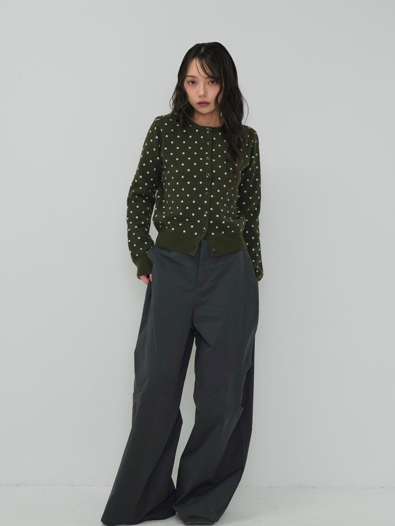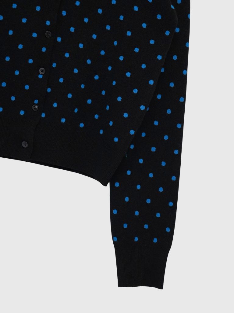 肌触りの良いニット素材を使用したドット柄カーディガン。